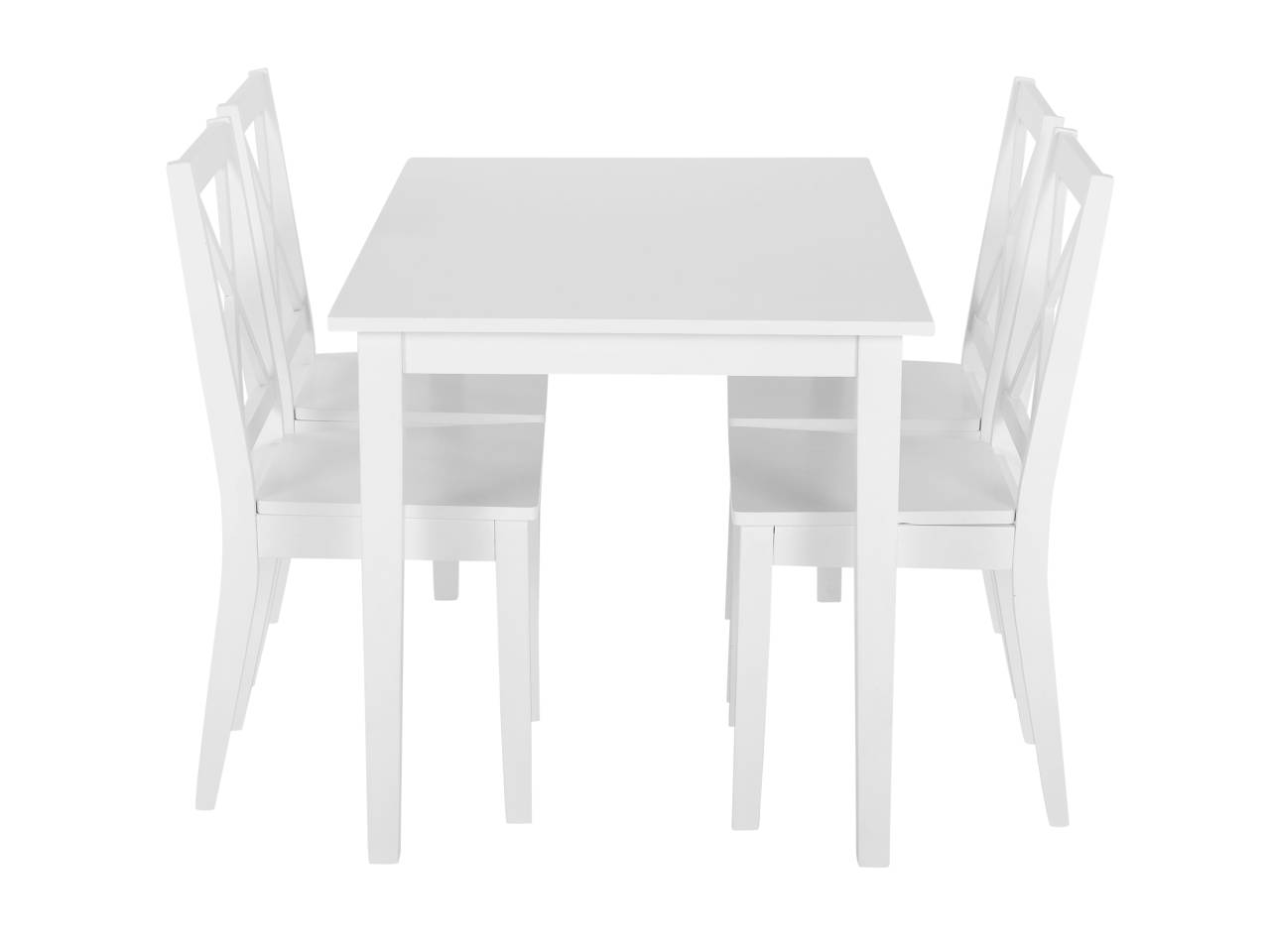 Matgrupp bestående av ett matbord och fyra stolar i vitlackerat gummiträ.