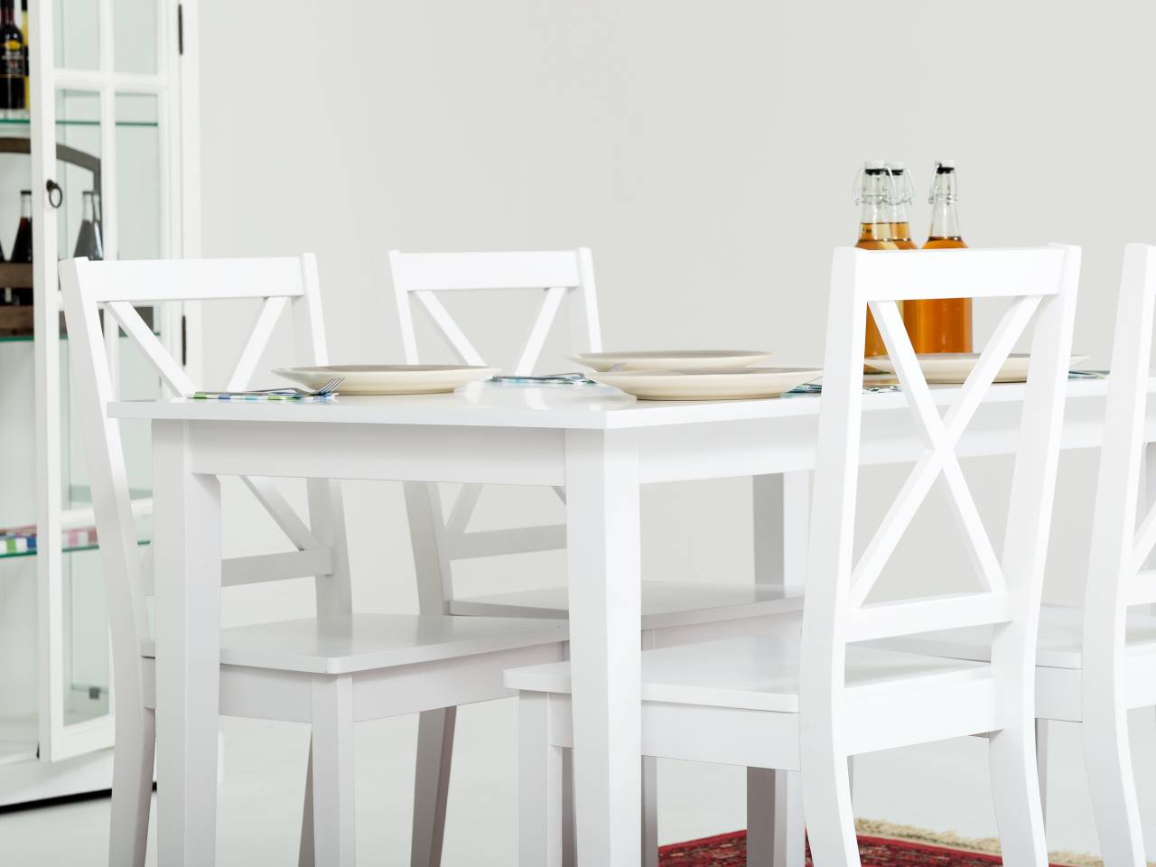 Vitt matbord med fyra vita stolar. Mått bord: L120 B75 H74 cm. Mer information