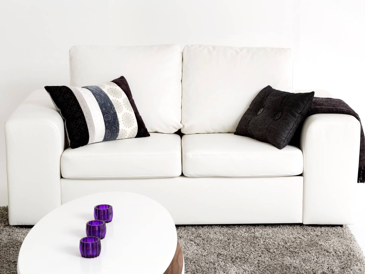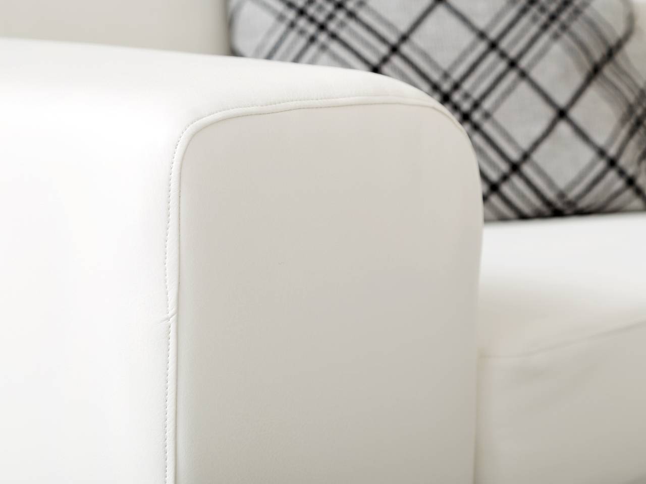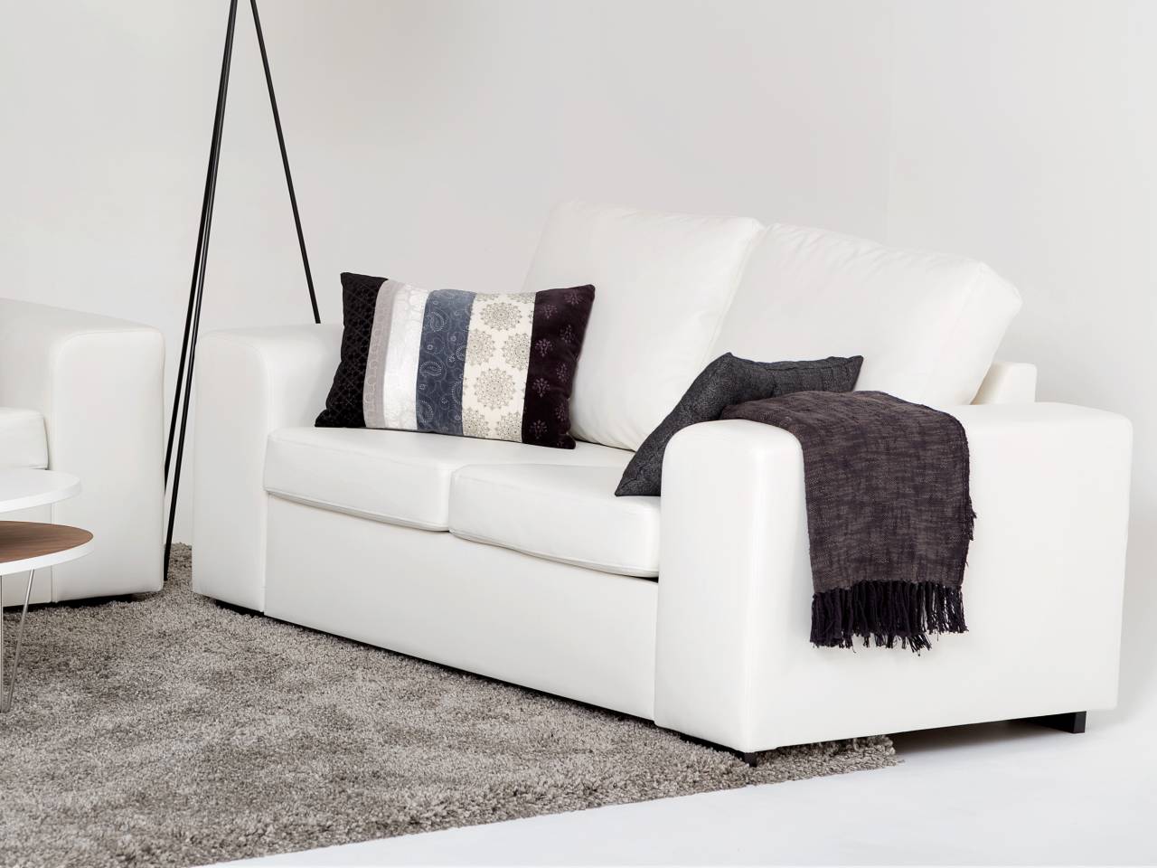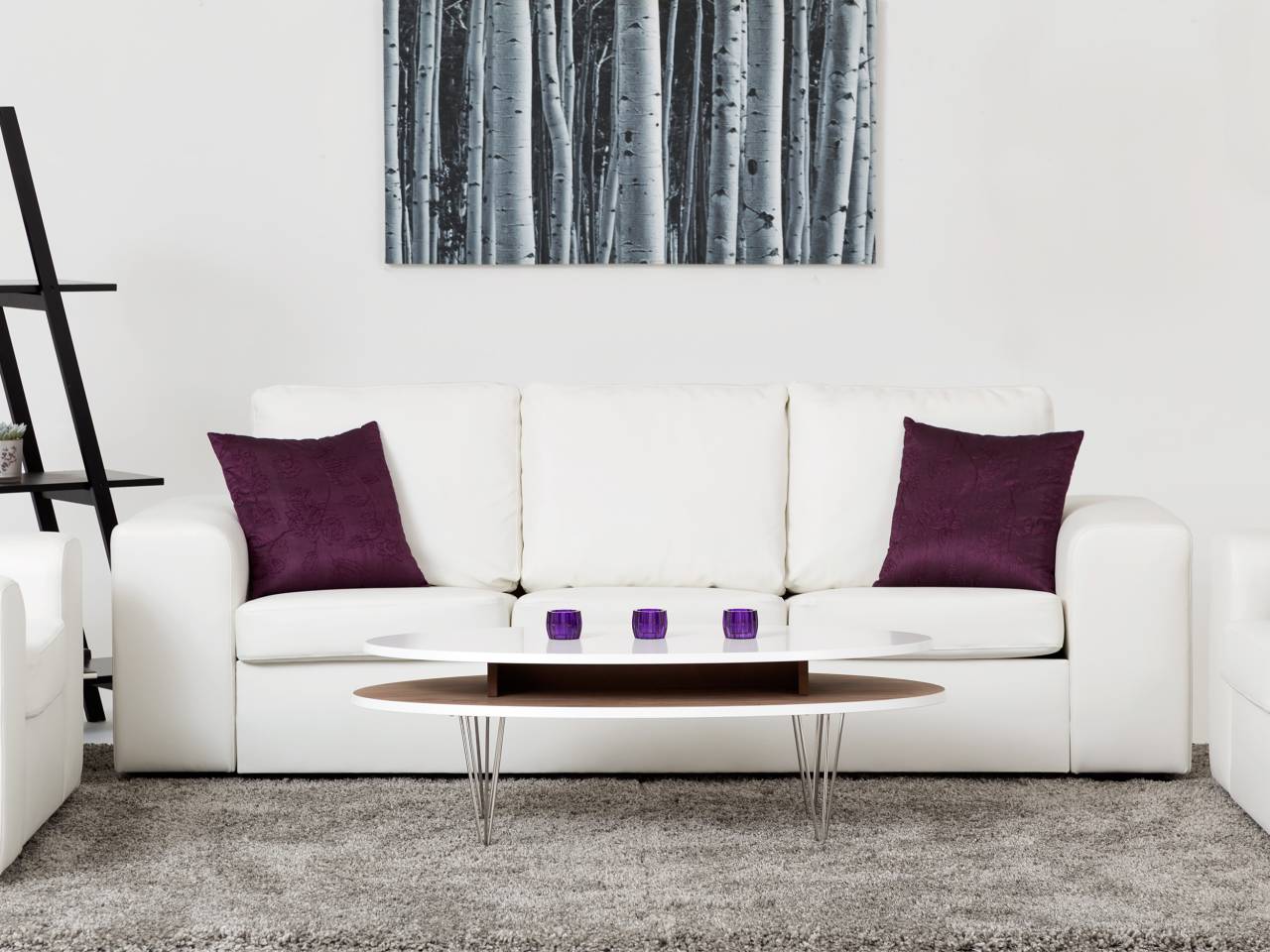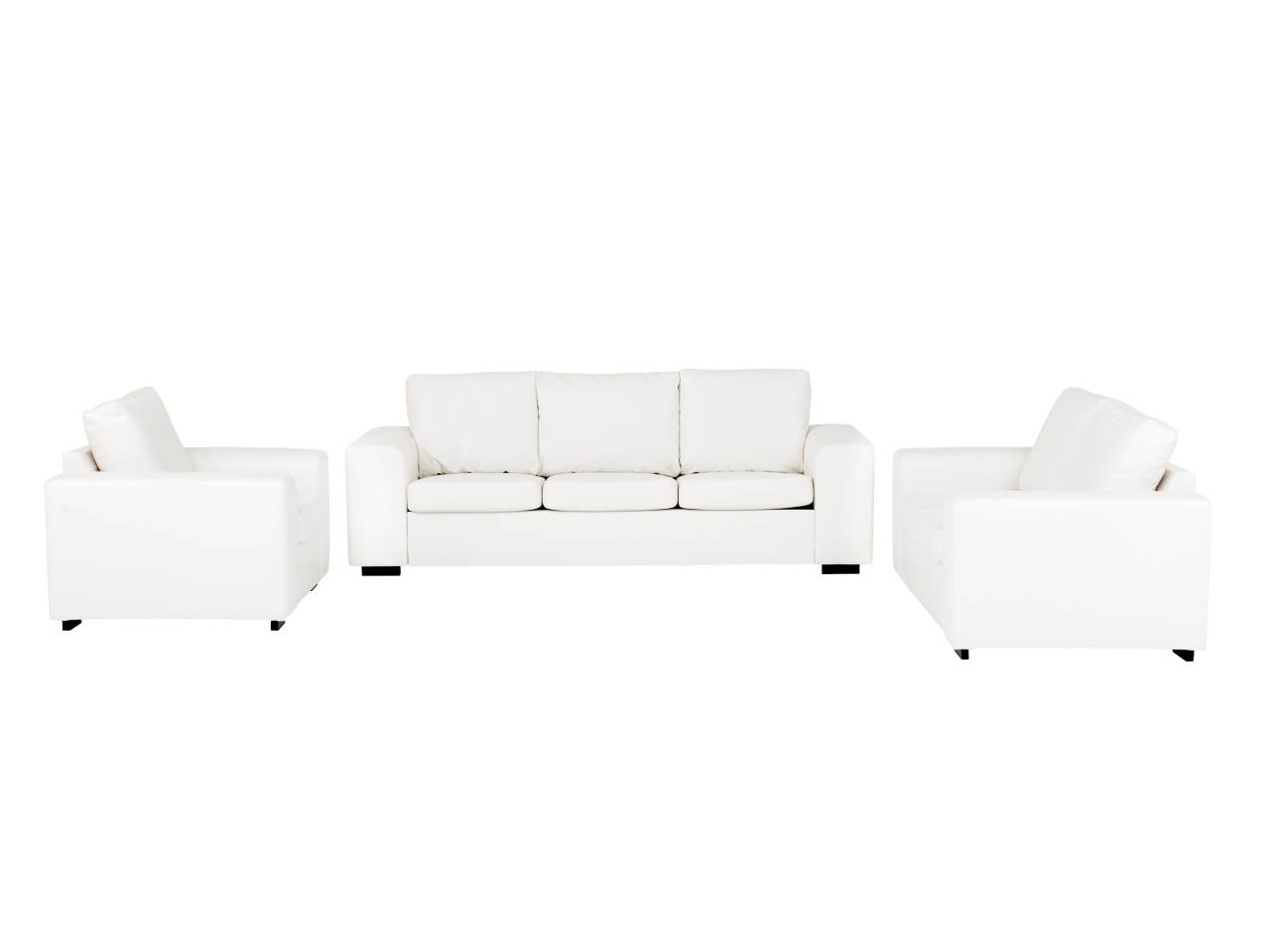 Soffgrupp bestående av en tresitssoffa, en tvåsitssoffa och en fåtölj i vitt ecoläder.
