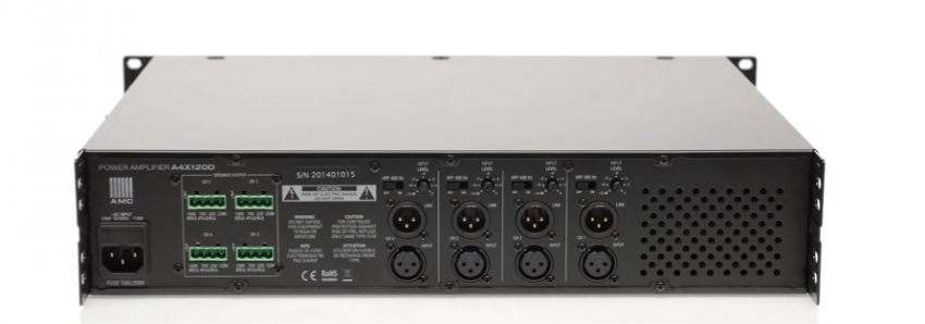 A4X120D high efficiency switching mode power supply D-class amplifier. Robust construction design, high quality components, traditional long lasting performance. All amplifier channels has 120W power, own individual gain control, HPF filter and output transformer. Designed for professional applications in medium and large scale voice evacuation and public address systems.