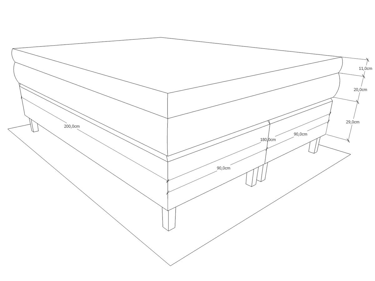 Resårbotten: Bonell, 125 fjädrar per m² av 2,2 mm tjock tråd, 29 cm hög.