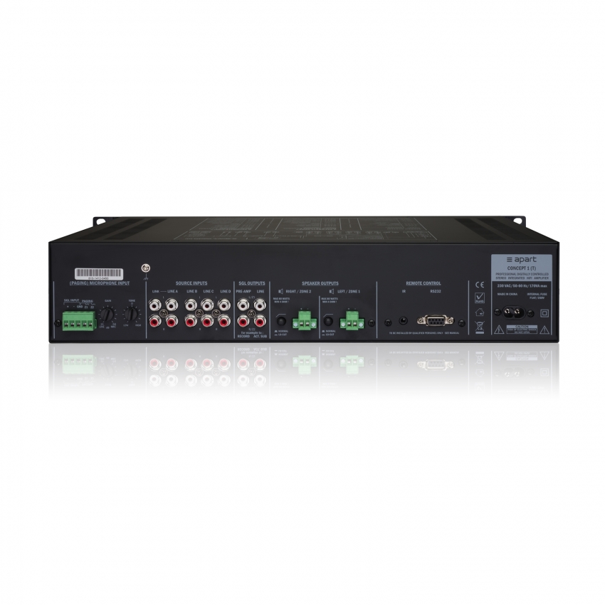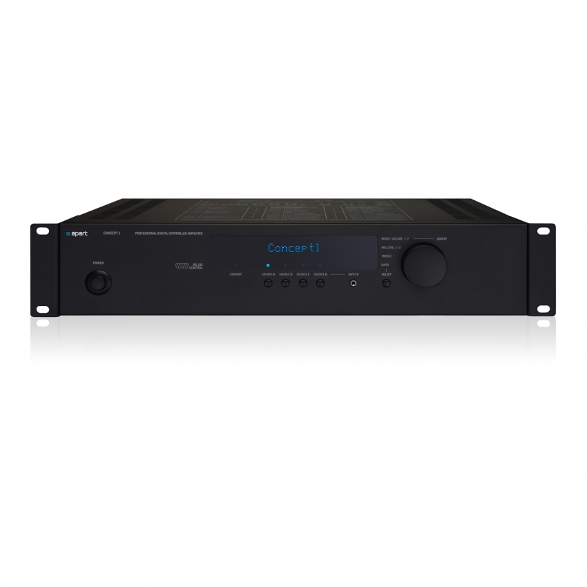 • For a long time, installers worldwide have been unhappy with consumer electronics and they were looking for a professional integrated amplifier for use in commercial environments, boardrooms or small businesses designed for 24/7 operation. Therefore, Apart developed the CONCEPT1, a stereo or two mono channel (2 x 80 watts @ 4 ohms) amplifier for small and medium-sized projects.